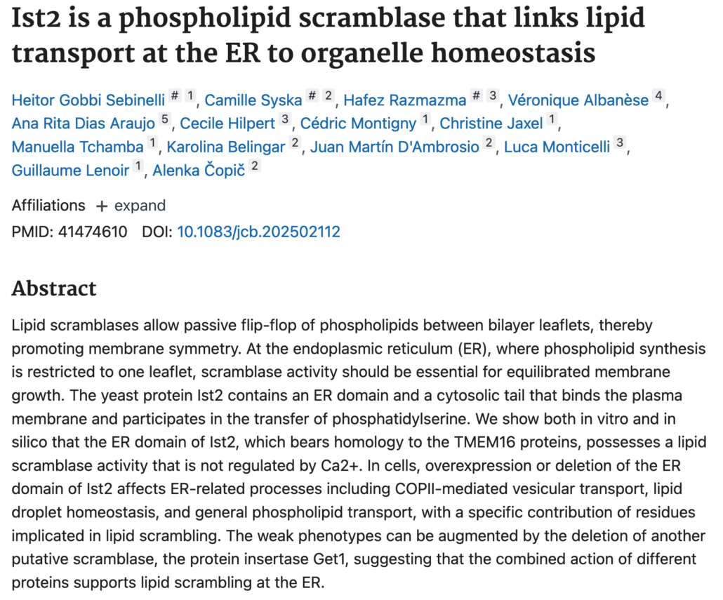 - Established and emerging players in phospholipid scrambling: A structural perspective. Sebinelli HG*, Syska C*, Čopič A, and Lenoir G. Biochimie 2024. in press (review article)