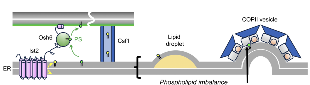 - Lipid transfer often occurs within membrane contact sites, which are regions of close apposition between organelles. We are particularly interested in the homeostasis of phosphatidylserine, which is synthesized in the endoplasmic reticulum, but is highly enriched in the cytosolic leaflet of the plasma membrane. We study how the yeast PS transfer protein Osh6 cooperates with an ER-PM tether Ist2 to deliver PS to the plasma membrane.