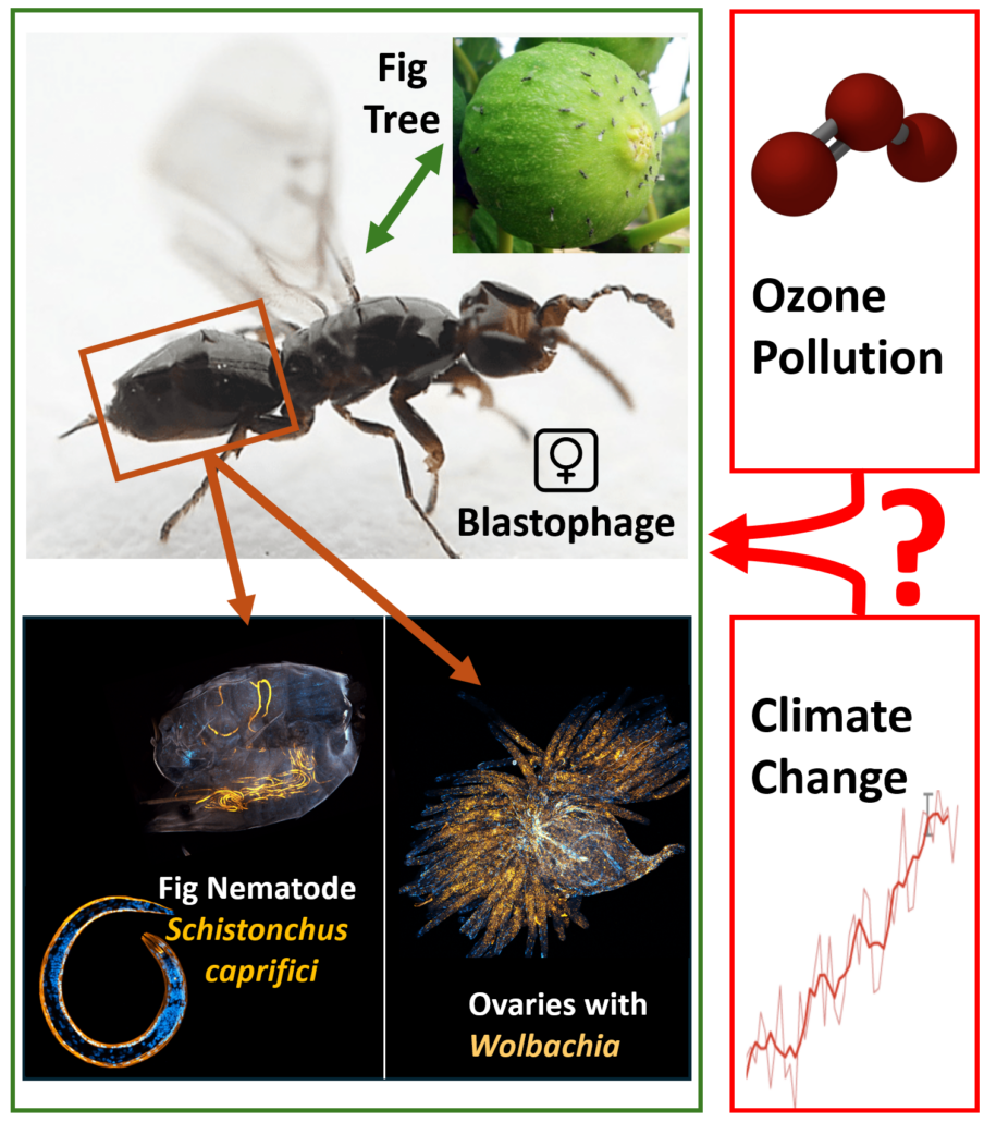 We have stablished that the fig tree pollinator, Blastophaga psenes, is Wolbachia-infected. This wasp is also the vector of Schistonchus caprifici nematodes. we analyze the interactions between these organisms using wild material (collected from caprifigs in the Montpellier countryside), and establish precisely the life cycle of these nematodes. In collaboration with Finn Kjellberg and Magali Proffit (CEFE), we are investigating the detrimental effects of ozone pollution and temperature increase. Exposed to such conditions, not only the plan-pollinator interaction is lost, but the Blastophage larval/nymphal lethality increases, suggesting possible impacts on the reproduction of surviving adults. Taken together, the fig/blastophage/Wolbachia/Schistonchus is an outstanding model to study and report the highly detrimental effect of Ozone at different scales in Nature, by focusing on the reproduction and development of these interconnected species.